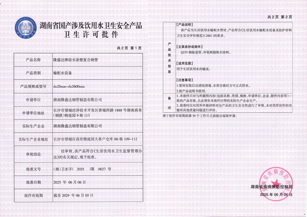 隆盛達(dá)牌給水涂塑復(fù)合鋼管管材&管件涉水批件
